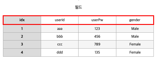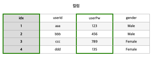 세로줄을 컬럼이라고 한다. 보통 한가지 속성(필드)에 대해 값들을 모아놓은 것이다.