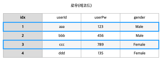 테이블의 가로줄을 로우 또는 레코드 라고 부르며, 필드의 값들이 있다.