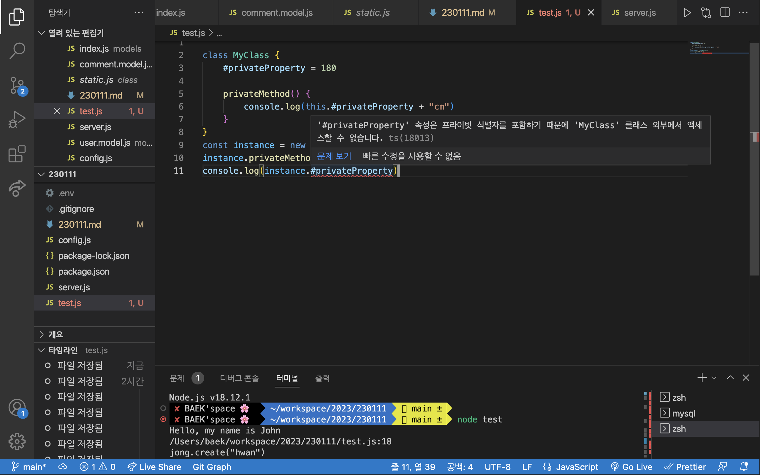 클래스 내부에서 프로퍼티나, 메서드에 '#'을 붙이면 클래스 외부에서 액세스 할 수 없는 상태로 선언할 수 있다.