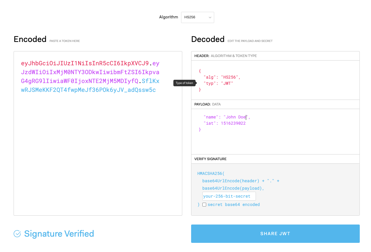 - HS256 : HMAC with SHA-256의 약자이고 대칭 암호화의 한 유형으로 토큰 서명 및 확인을 하는데 개인키를 사용한다. 대칭 암호화이기 때문에 개인키가 전송하는 측과 전송받는 측 두 군데에 있다.