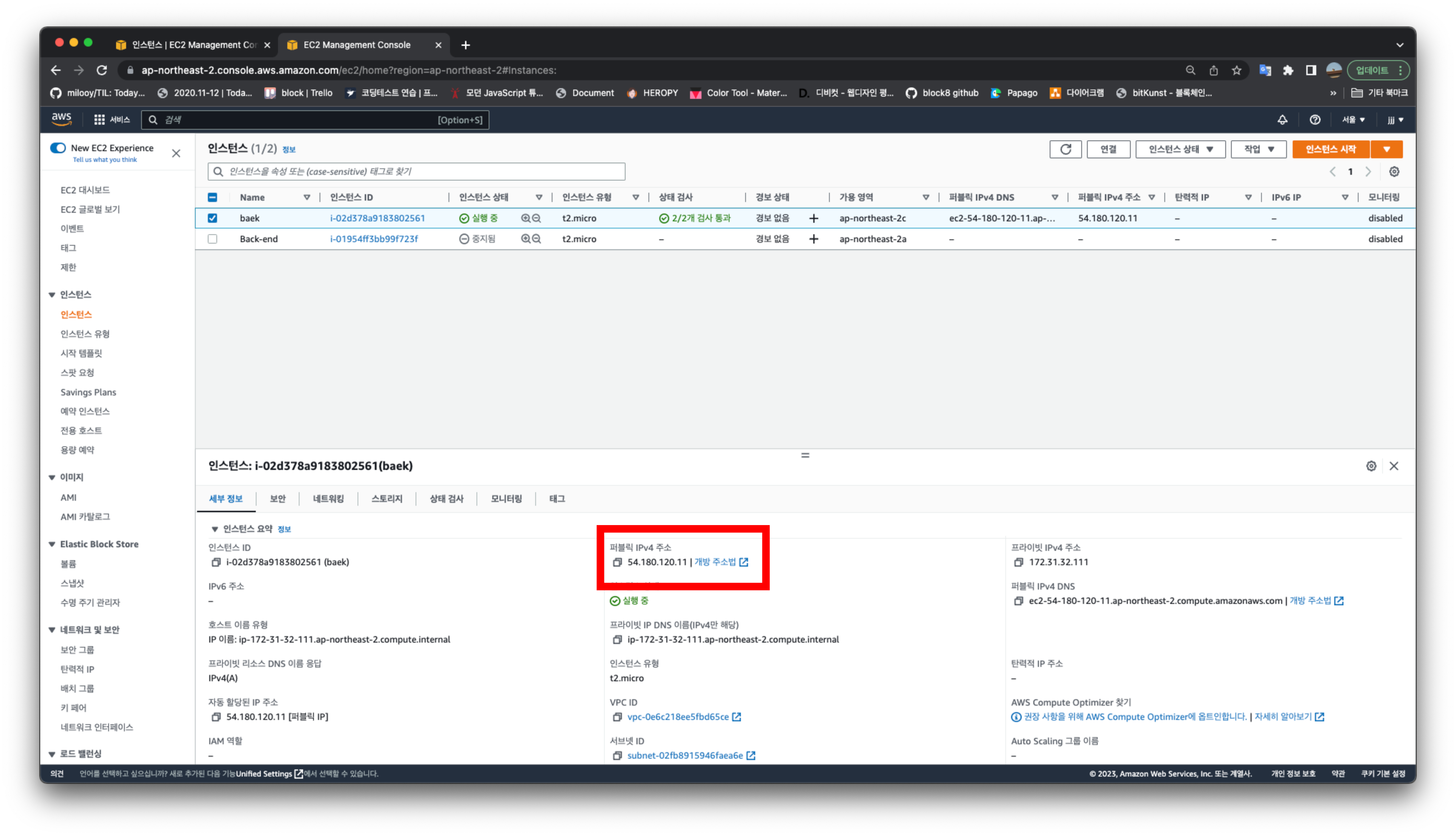 인스턴스 탭에서 원하는 인스턴스를 체크하고 하단의 정보를 보면 퍼블릭 IP를 확인할 수 있다.