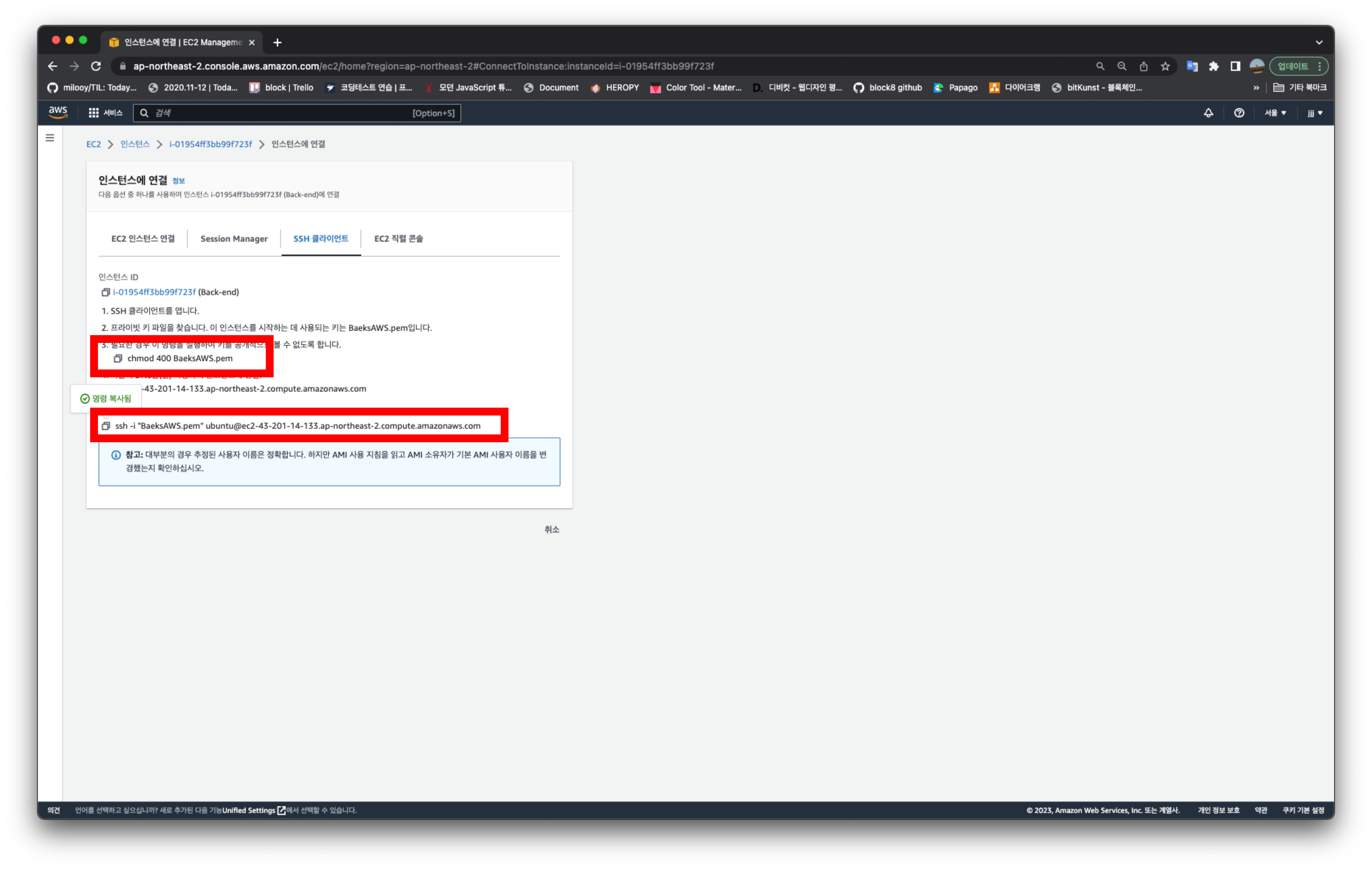 2. 인스턴스 연결을 위한 정보가 적혀 있는 창이 뜬다. 뒤에 작업할 때 필요하니까 따로 창을 열어 둔다.