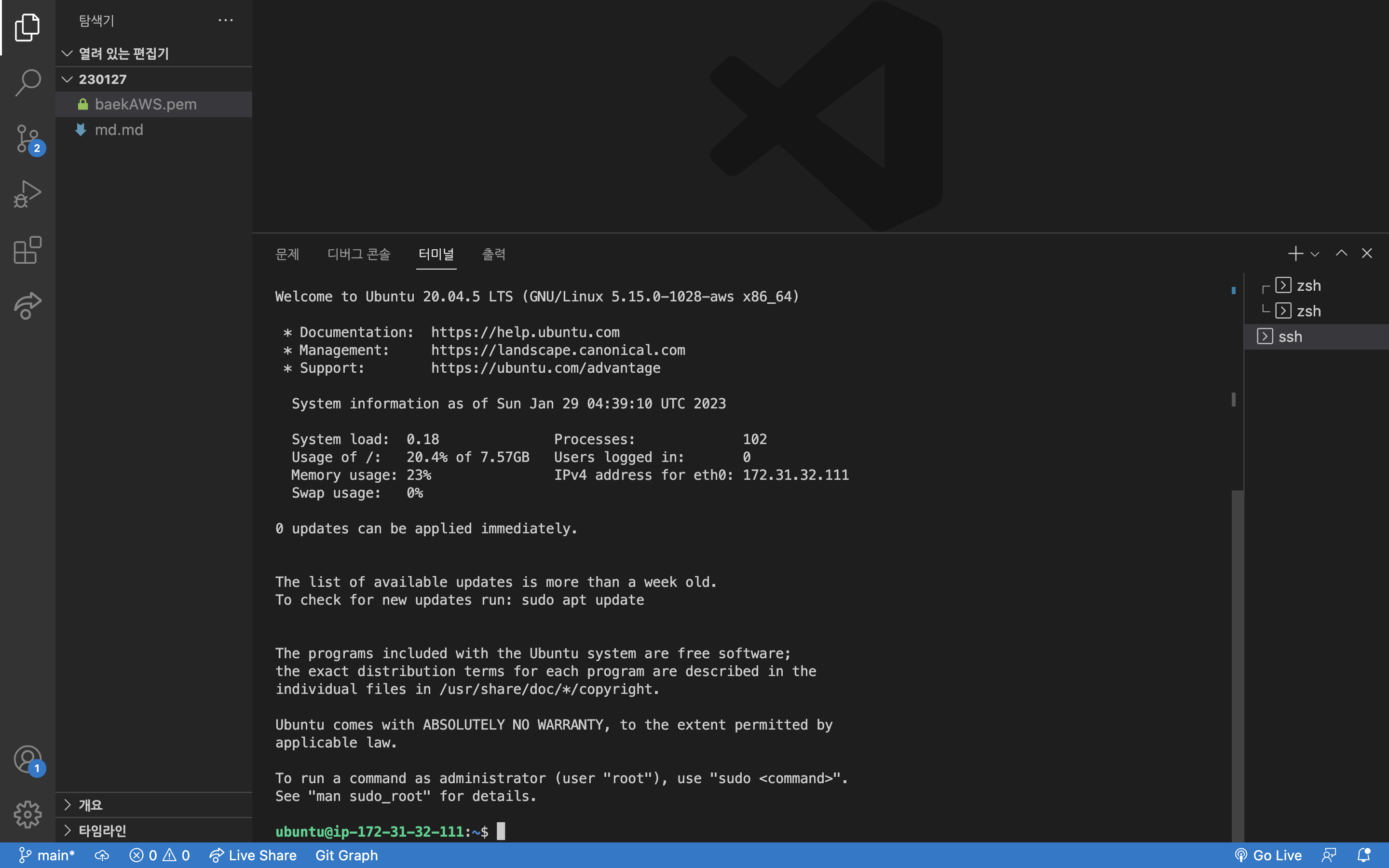 연결을 해서 나오는 터미널의 내용은 내 컴퓨터에 있는 리눅스 환경이 아닌 AWS의 서버 내에 내가 할당받은 컴퓨터의 정보이다.
