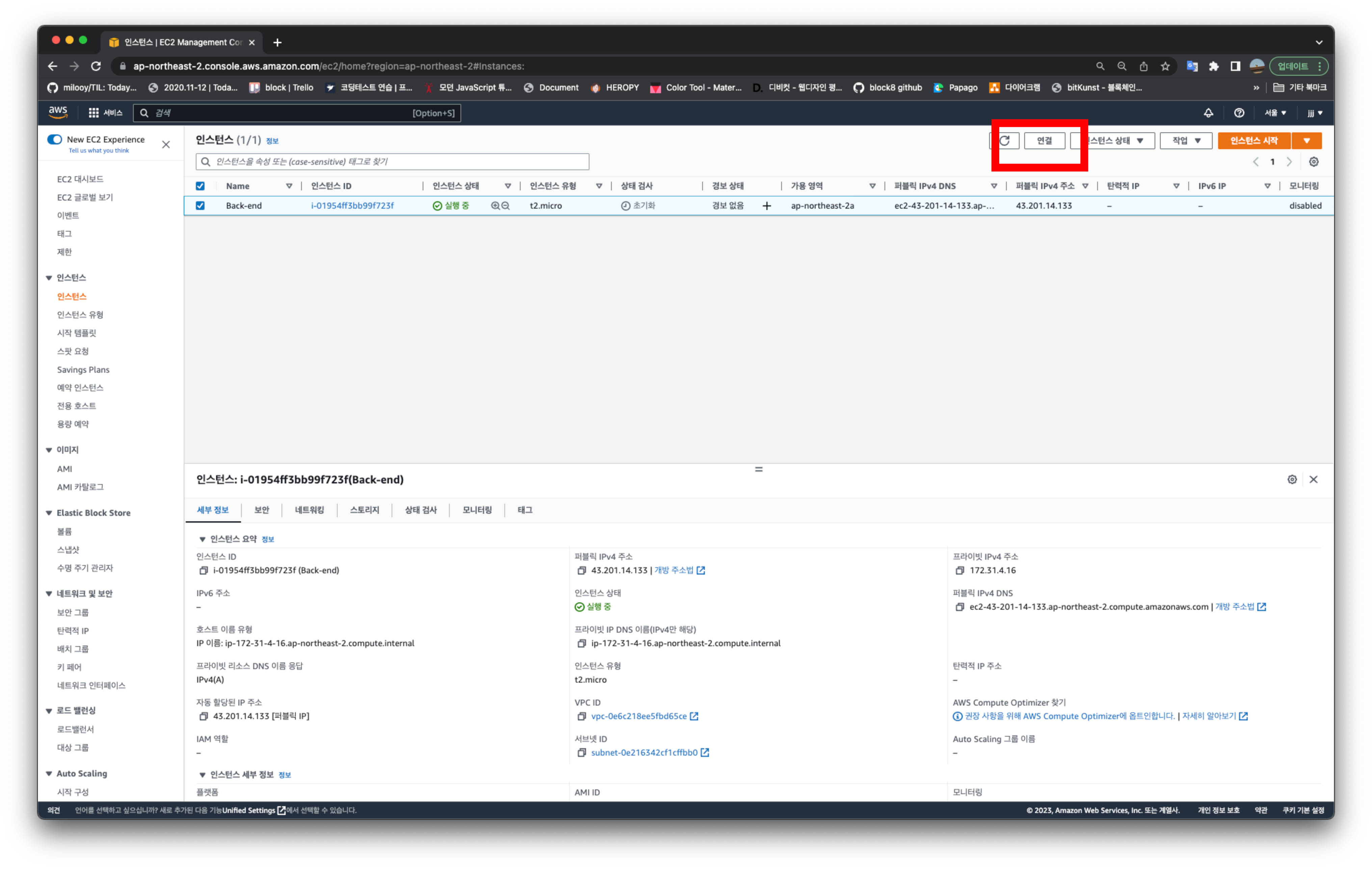 1. 인스턴스 탭에서 원하는 인스턴스를 체크하고 연결을 누른다.