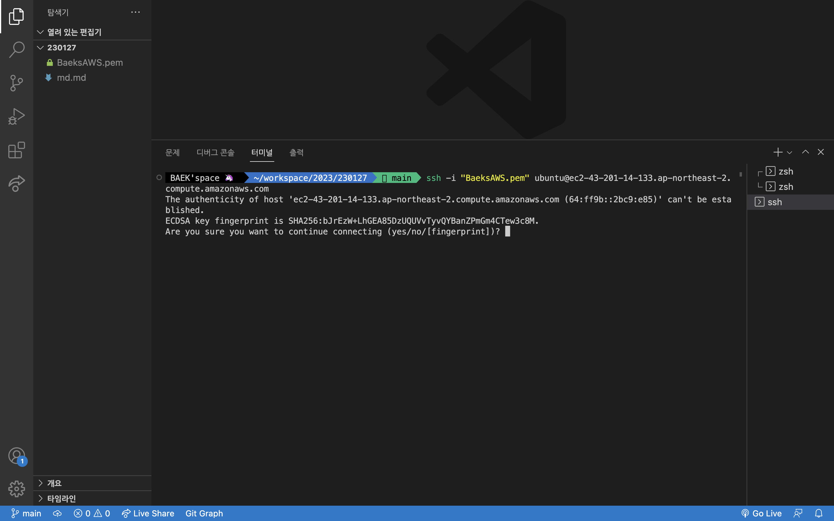** 만약 SSH 명령어 부분을 기입하고 접속하려고 했을 때 공개키라 안된다 라는 내용의 오류가 발생해서 사진과 같은 연결이 안 된다면