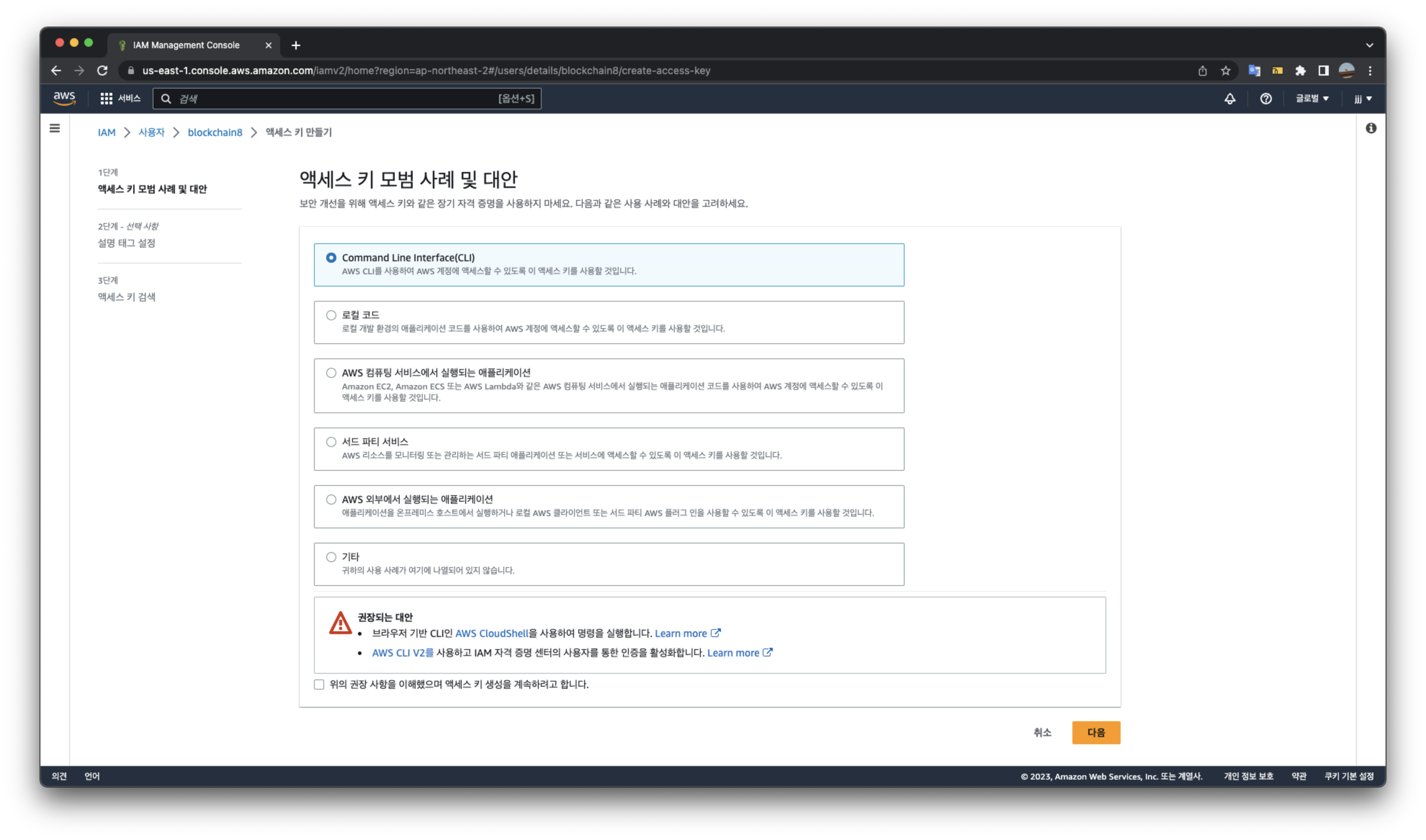 `Command Line Interface(CLI)` 를 선택하여 액세스 키를 만든다.