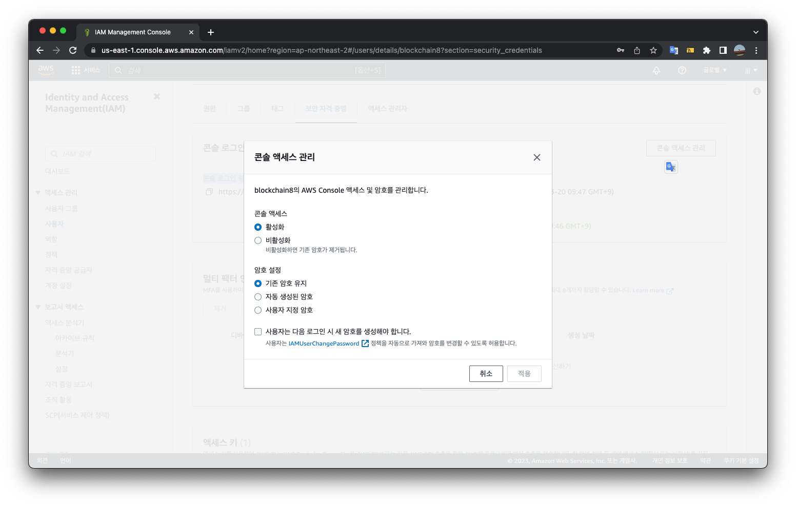콘솔로그인에 주어진 콘솔 로그인 링크 주소를 통해서 IAM 계정으로 로그인페이지로 이동할 수 있고, 콘솔 액세스 관리 버튼을 이용해서 암호를 활성화할 수 있다.