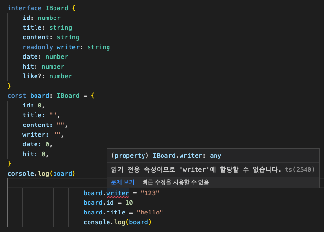 읽기 전용 속성을 가진 인터페이스를 구현하는 객체에서는 해당 속성을 가진 값을 다시 설정할 수 없다.