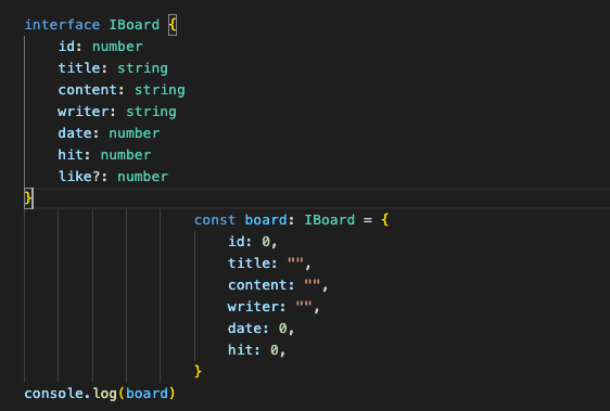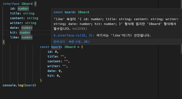 인터페이스는 만들지만 있을 수도 있고, 없을 수도 있는 프로퍼티에 대해서 '?' (물음표기호)를 이용하여 작성하면 누락된 속성에 대한 에러가 발생하지 않는다.