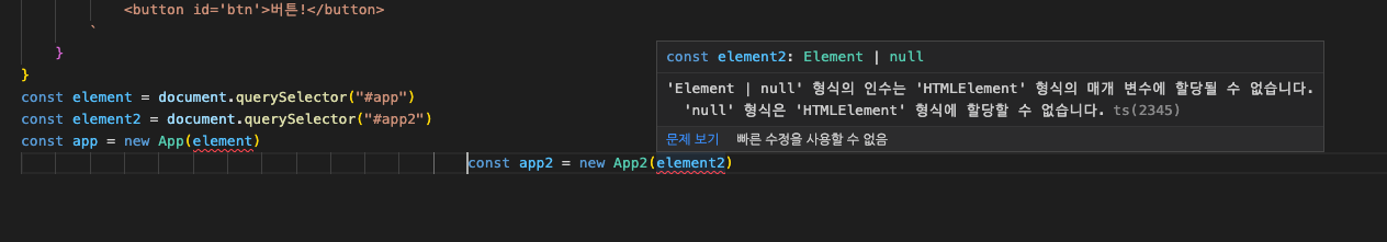 이를 해결하는 방법은 반환 값의 데이터 타입을 HTMLElement 타입으로 강제로 변환시키는 방법이 있다.