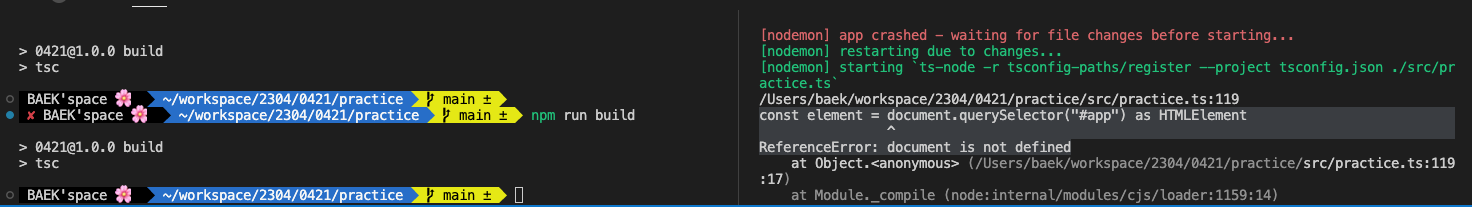 TS파일에서 document.querySelector()을 사용한 부분에 에러가 발생한 것을 확인했다. querySelector()가 HTMLElement | null 형식을 반환하기 때문이었고,