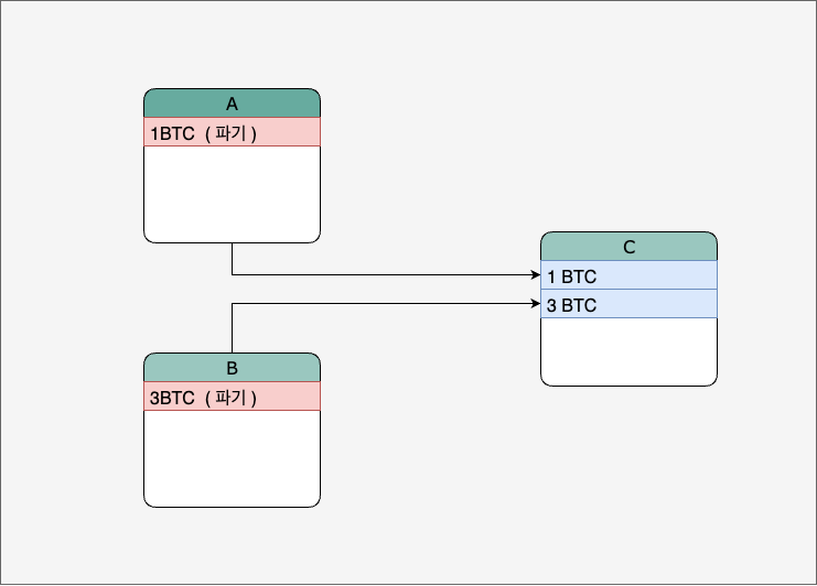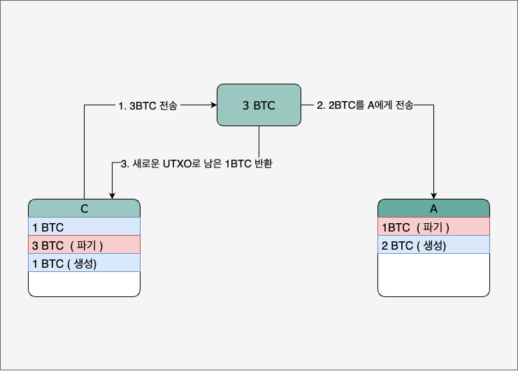 이후 C가 다시 A에게 2 BTC를 주게 된다면, C는 가지고 있던 1 BTC와 3 BTC 중 3 BTC를 사용하여 2 BTC를 보낸 후 남은 1 BTC를 새로운 UTXO로 다시 반환받는다. 그리고 기존의 사용한 3 BTC UTXO는 파기가 된다.