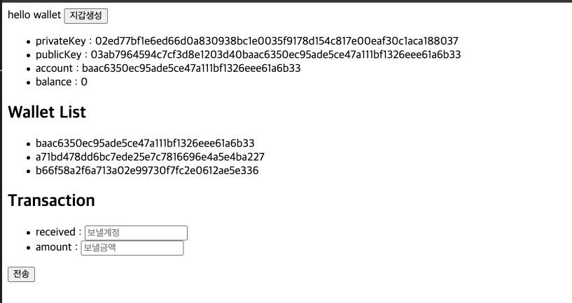privateKey, publicKey, account의 경우에는 브라우저 서버에서 단순히 메서드 호출을 이용해서 화면을 그릴 수 있지만, balance의 경우에는 UTXO(미사용 트랜잭션 출력값)을 이용해서 구해야 하기 때문에 노드에서 해당 account에 대한 UTXO만 얻어서 잔액을 구할 것이다.