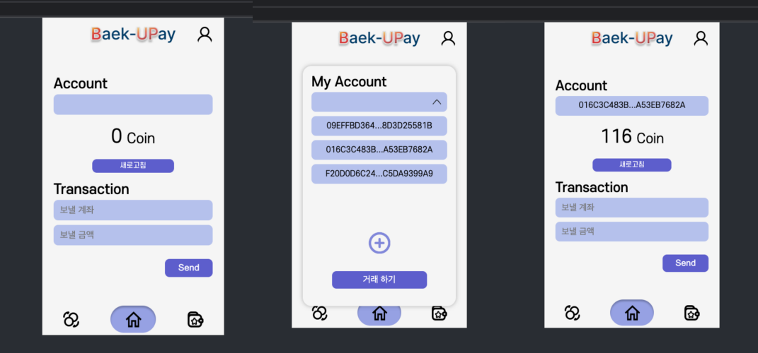 최초 진입 시에는 Account에 빈값을 가져온다. 하지만 우측 상단 사람아이콘을 이용하여 나의 계정을 선택하면 선택된 Account 및 잔액에 대한 정보를 얻을 수 있다. 이후 계정에 대한 정보는 전역으로 관리하여 화면이 바뀌는 상황에서도 상태를 유지할 수 있다.