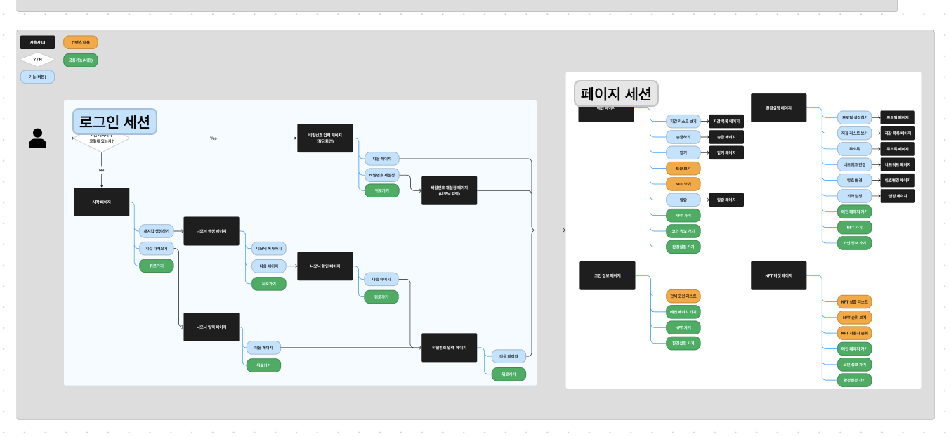 기본적인 페이지와 기능을 파악하기 위한 플로우차트를 작성하였고, 이를 통해서 어느 정도 진행이 되는지를 확인할 수 있도록 했습니다.