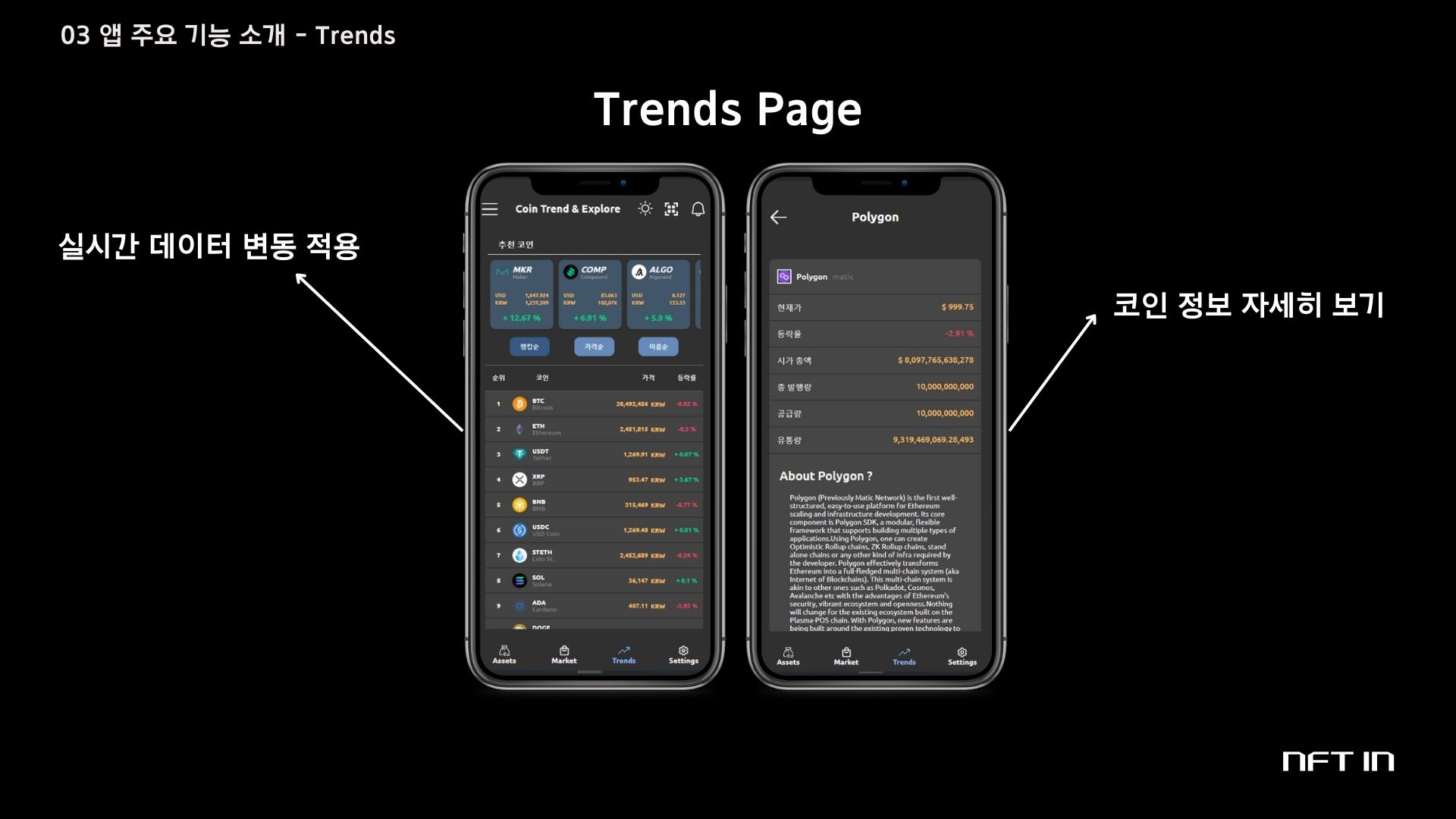 NFTin 애플리케이션의 주요 기능은 크게 보유한 코인을 확인할 수 있는 메인 페이지, NFT Market팀과 연동된 마켓페이지, 코인정보를 볼 수 있는 트렌드 페이지, 세팅 페이지로 구성되어 있습니다.