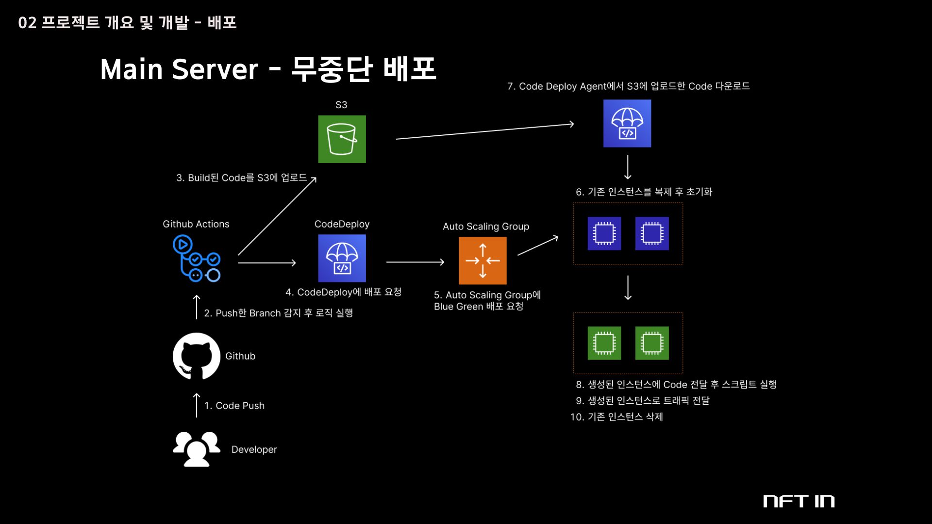생성된 인스턴스에 코드가 전달되면 스크립트를 실행하고 스크립트가 오류가 나지 않으면 기존 서버로 가던 트래픽을 생성된 인스턴스로 전환합니다. 이후 기존에 사용하던 인스턴스를 삭제함으로써 무중단배포가 완료됩니다.