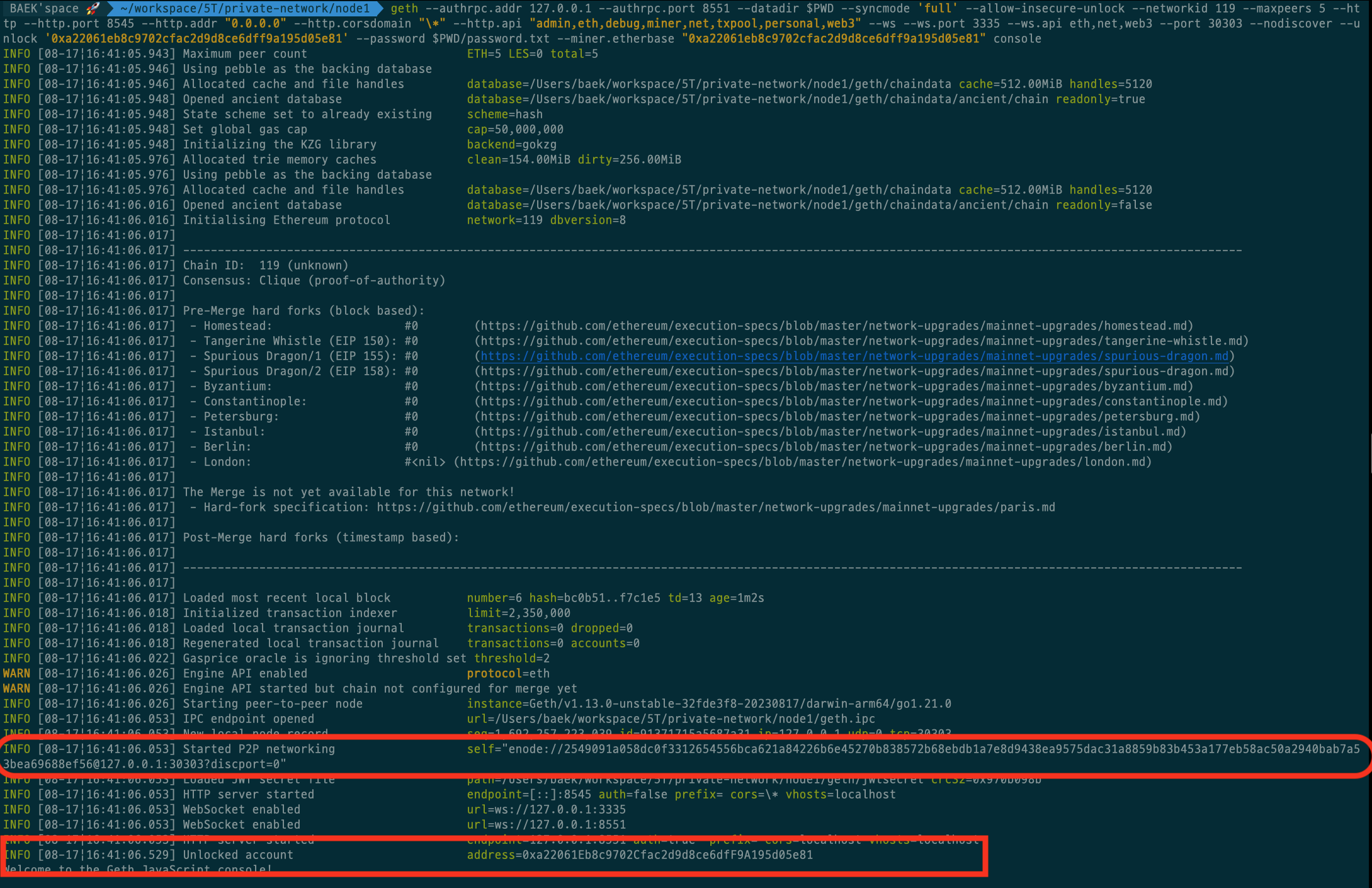 - --bootnodes : 노드가 다른 노드와 연결할 때 사용한다. 실행 중인 'enode' URL을 지정해주어야 한다.