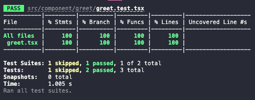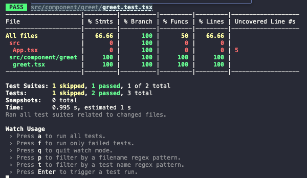 coverage에 --watchAll 옵션을 추가해서 사용하게 되면 파일이 변경될 때 자동으로 실행하는 것뿐 아니라 조금 더 자세한 결과를 볼 수 있다.