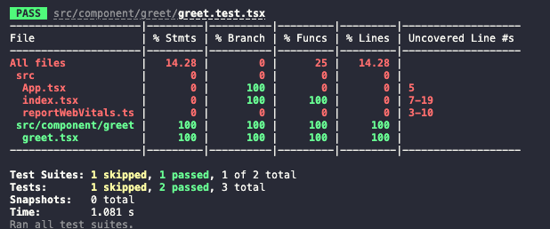 "coverage": "react-scripts test --coverage" // test와 동일한 스크립트에 --coverage를 추가한다.