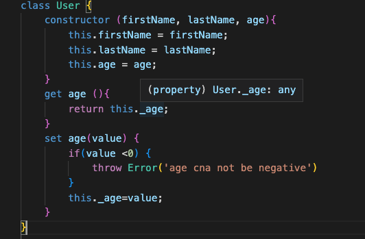 Age라는 getter을 정의하면 this.age 는 getter 을 호출하게 된다. 그리고 setter을 정의하면 =age; 가 setter을 호출하게 된다.