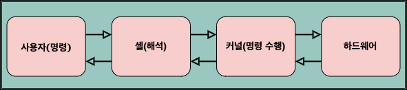 - Shell(셸) : 명령 해석기라고도 하는 shell(셸)은 리눅스의 사용자 인터페이스로서 사용자와 커널 사이의 중간자 역할을 담당한다.