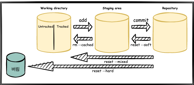 지우고 working direcory와 repository가 같게 해 준다. - 하드는 완전히 지우는 것이지만 복구하는 방법이 있다.