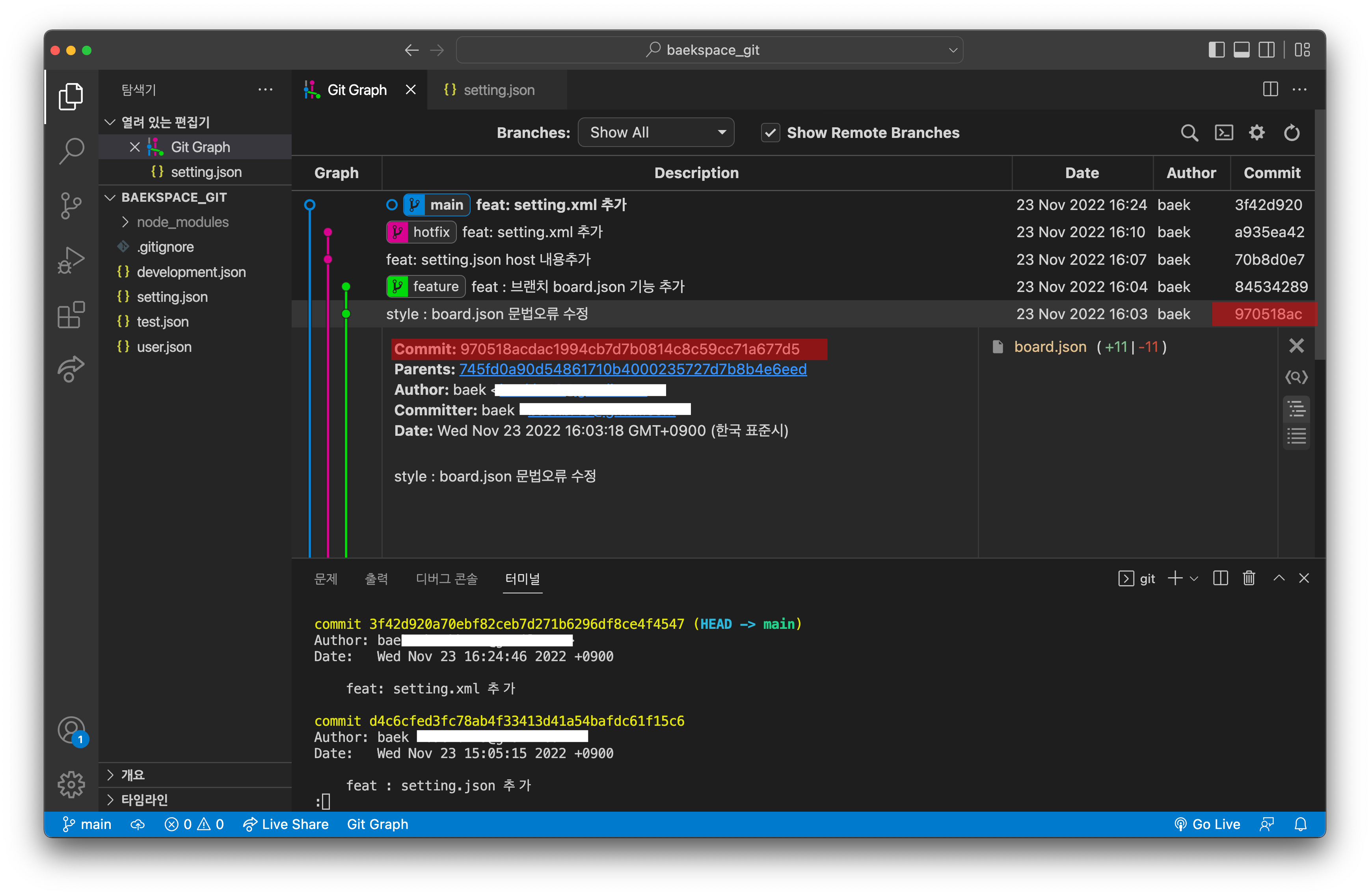 vscode에서 맥북 기준control(^) + shift + ₩(백틱) 을 누르면 터미널 창이 하단에 생성된다.