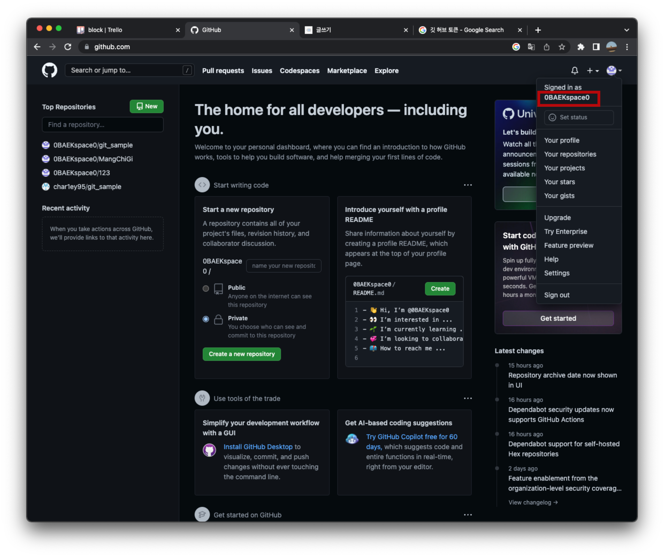 - 계정 이름 : github의 계정 이름을 적어주세요. (이메일이 아니고 계정 이미지 눌렀을 때 2번째 줄에 나오는 계정 이름)