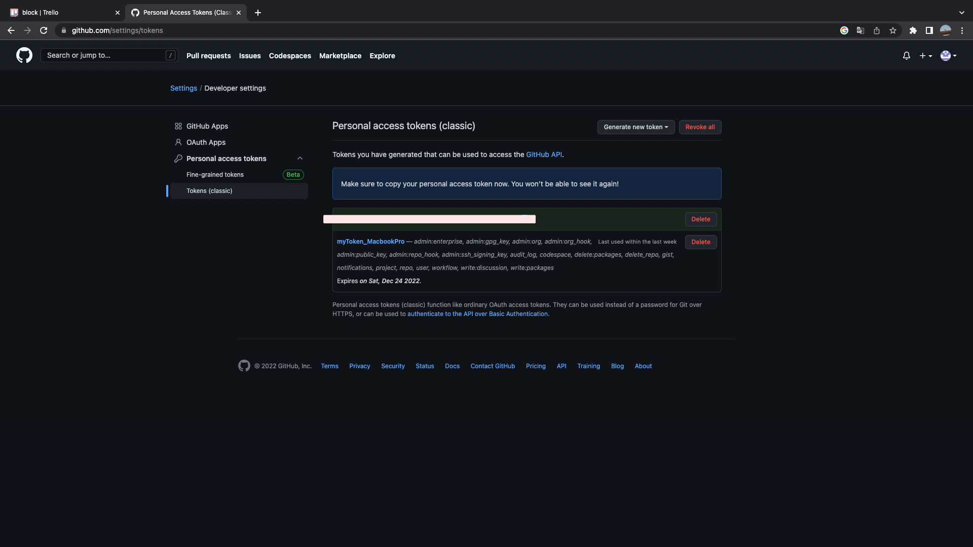 8. 흰색 박스안에 개인용 토큰이 발급된다. 발급된 토큰을 메모장 같은 곳에 잠깐 복사하여 두세요.