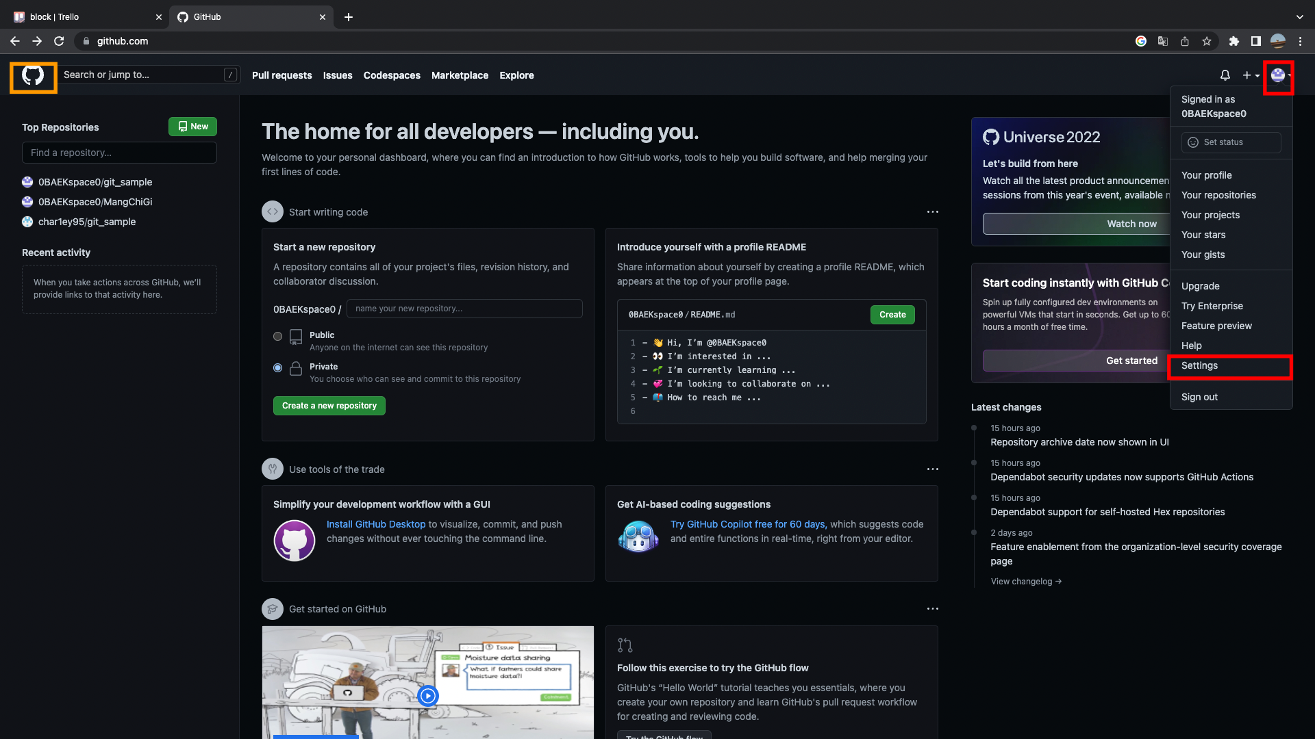 2. 우측 상단에 내 계정 사진을 누르시고 밑에 Settings로 진입합니다.