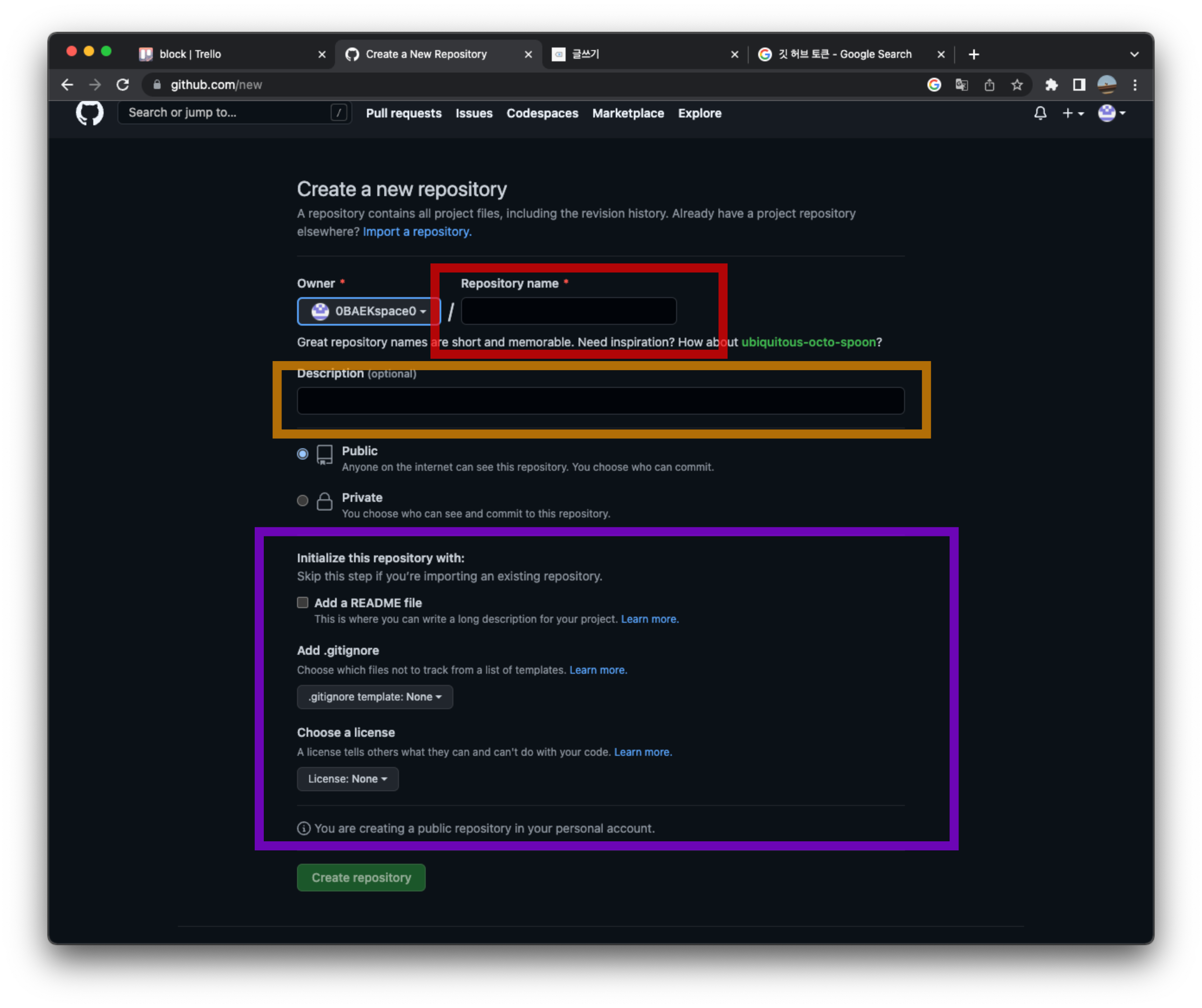 보라색 박스에는 원격 저장소를 만들면서 기본적으로 생성할 파일을 정할 수 있습니다.