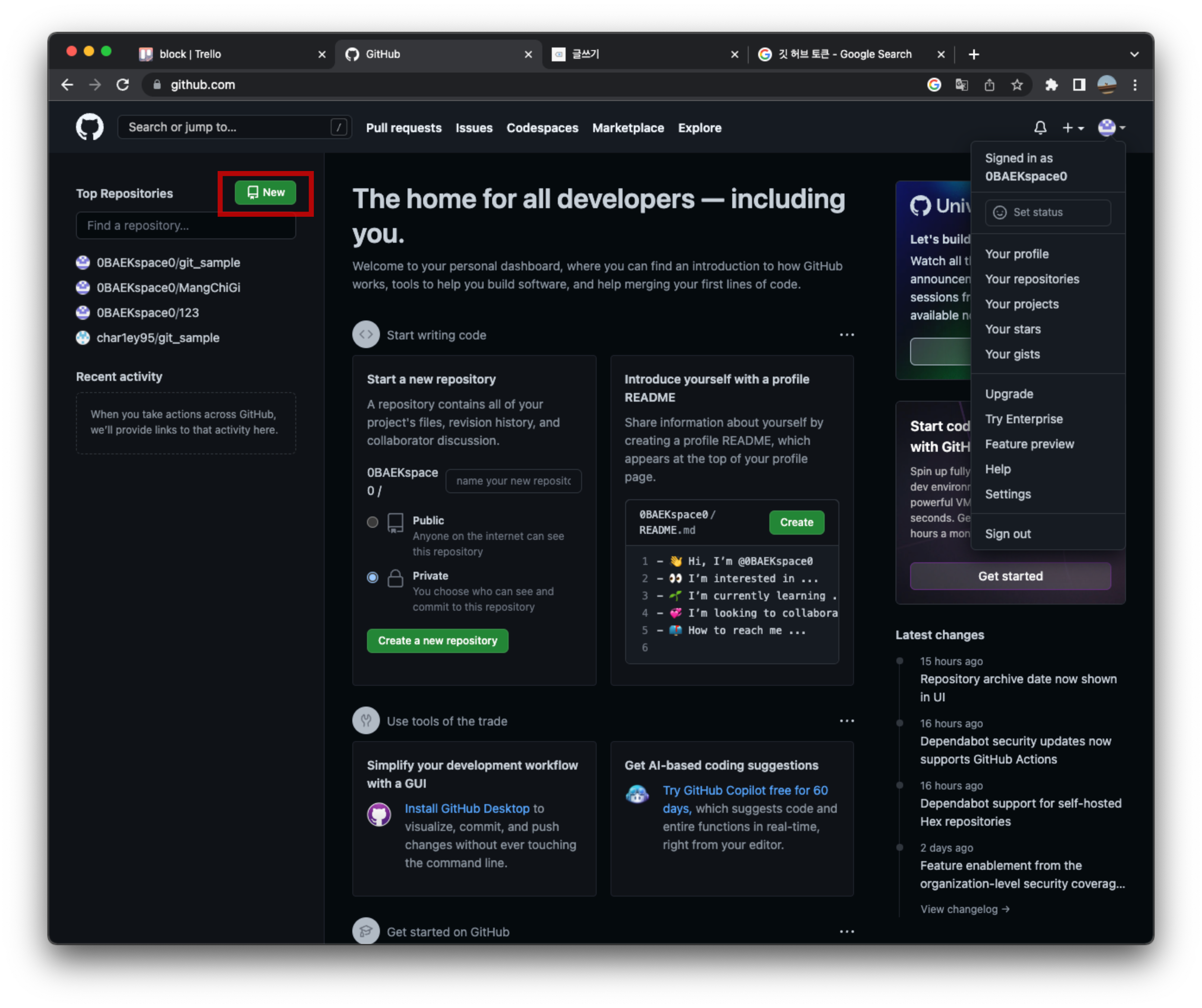 빨간색 박스의 New를 이용하면 새로운 원격 저장소를 만들 수 있습니다.