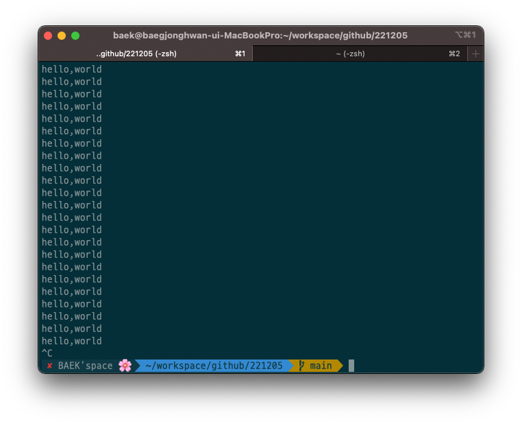 control + c를 한번 누르면 ^C가 출력됨과 동시에 종료됩니다.