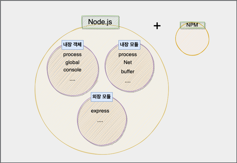 Node.js에서 내장 객체, 내장 모듈, 외장 모듈을 사용할 수 있고, 설치하면서 기본적으로 NPM이라는 것이 설치된다.