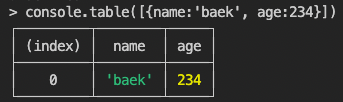 console.table([{name:'baek', age:234}])